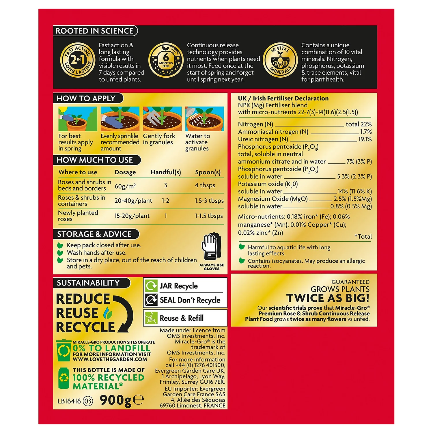 Long lasting feed containing essential nutrients to give strong healthy plants! Miracle-Gro Rose & Shrub Continuous Release Plant Food contains a temperature controlled coating which regulates the release of nutrients when conditions are right for feeding. One application feeds plants for up to 6 months, removing the need for regular feeding.